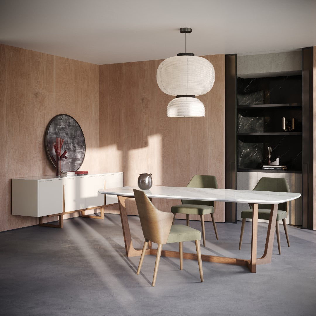 Για όσους επιθυμούν να προσθέσουν ένα 60s look μέσα στον χώρο τους, τους προτείνουμε την διαχρονική τραπεζαρία Carino. Το Carino είναι μία κατασκευή με ποιοτικές λεπτομέρειες και σύγχρονη σχεδίαση. Η βάση κατασκευάζεται από μασίφ ξύλο, ενώ το καπάκι παράγεται τόσο με κεραμικό, όπως παρουσιάζετα εδώ, όσο και με ξύλο.